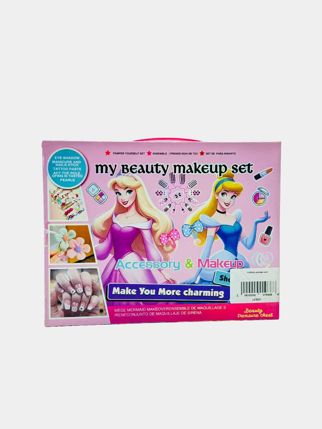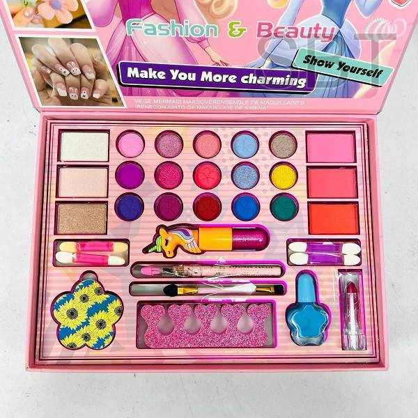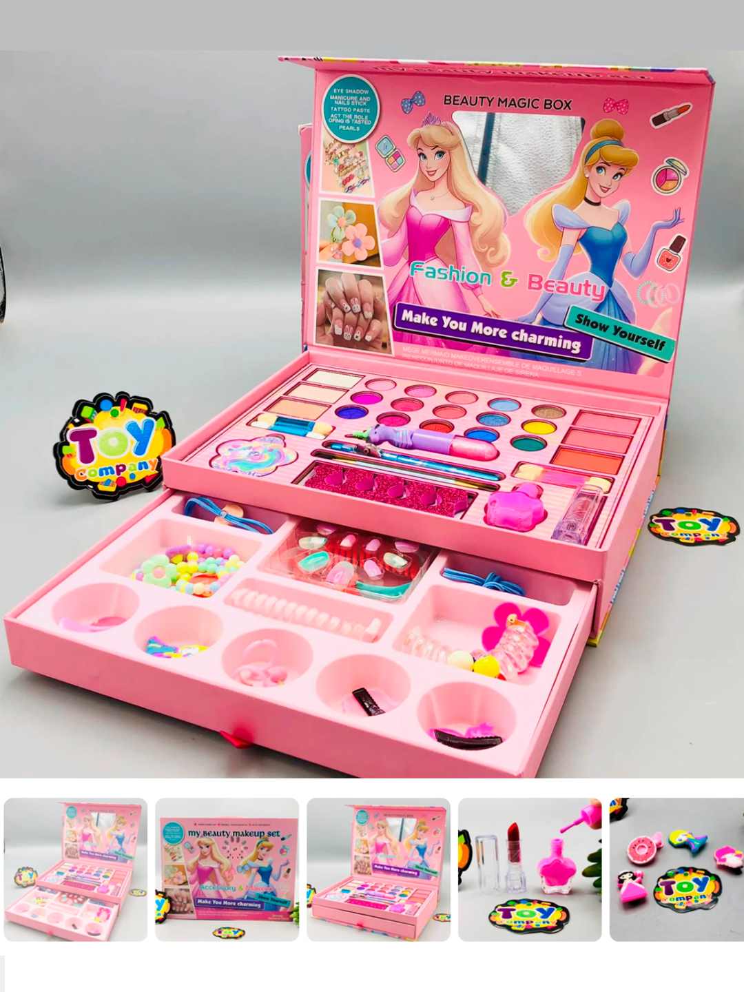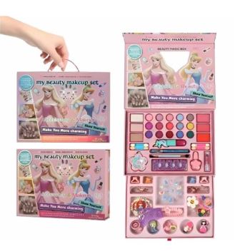 این مجموعه شامل: برق لب، سایه چشم، برس‌های آرایشی، لاک ناخن، آینه و سایر لوازم جانبی است. 🔸 جنس: ایمن، اجزای ضد حساسیت، مناسب برای پوست کودکان. 🔸 سن: از ۳ سال به بالا. 🔸